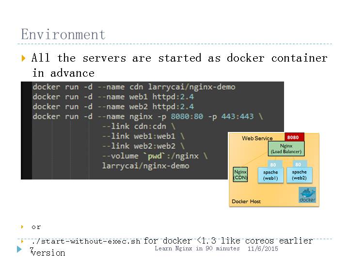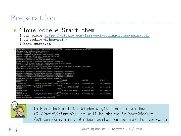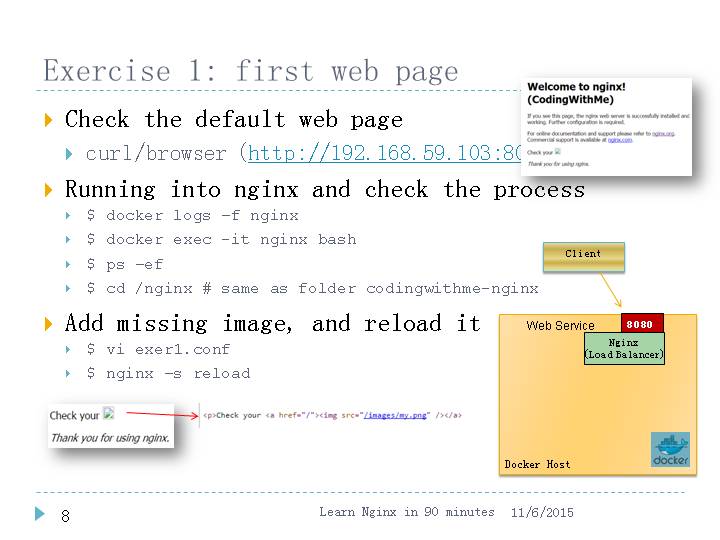 Clone code & Start them$ git clone https://github.com/larrycai/codingwithme-nginx.git$ cd codingwithme-nginx$ bash start.sh