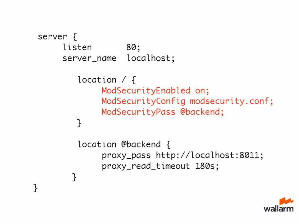 location / { ModSecurityEnabled on; ModSecurityConfig modsecurity.conf; ModSecurityPass @backend;