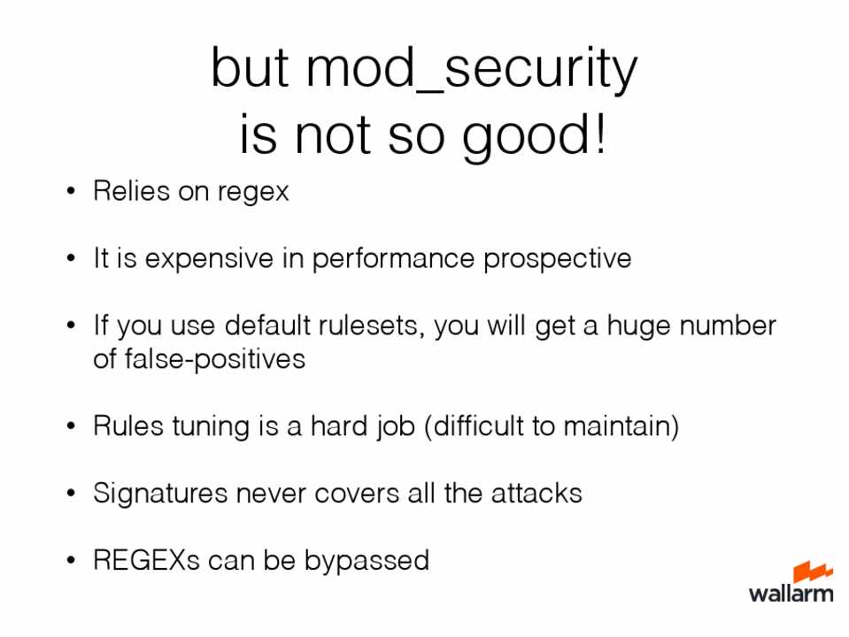 Pros: • Pretty fast! • Update independent • Resistant to many waf-bypass techniques