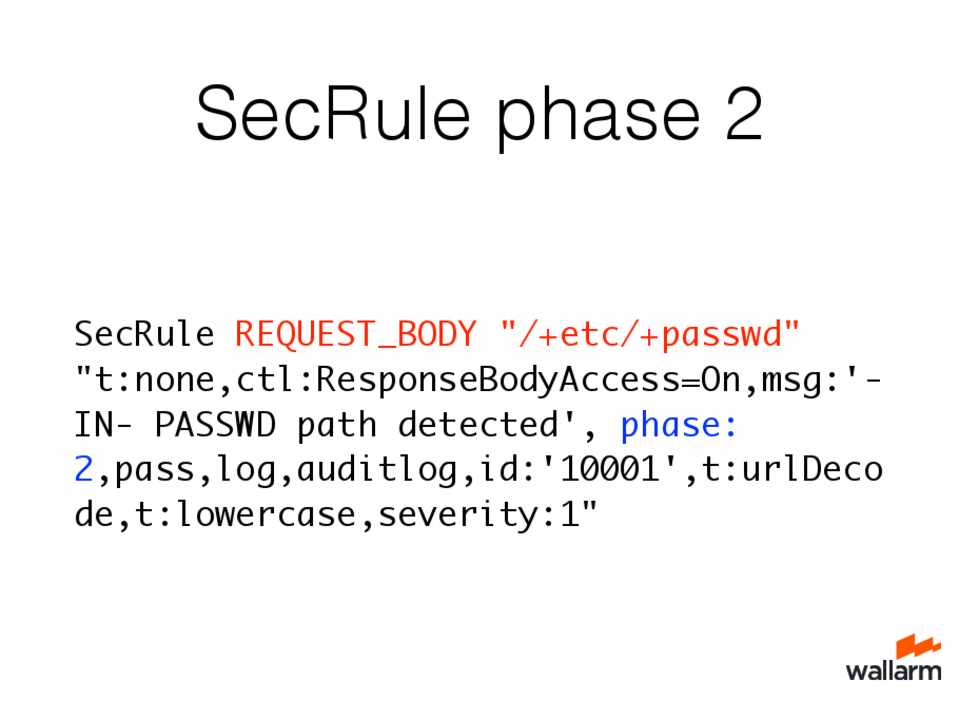 SecRule REQUEST_BODY "/+etc/+passwd" "t:none,ctl:ResponseBodyAccess=On,msg:'IN- PASSWD path detected', phase: 2,pass,log,auditlog,id:'10001',t:urlDeco de,t:lowercase,severity:1"