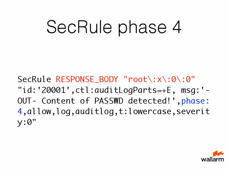 SecRule RESPONSE_BODY "root\:x\:0\:0" "id:'20001',ctl:auditLogParts=+E, msg:'OUT- Content of PASSWD detected!',phase: 4,allow,log,auditlog,t:lowercase,severit y:0"