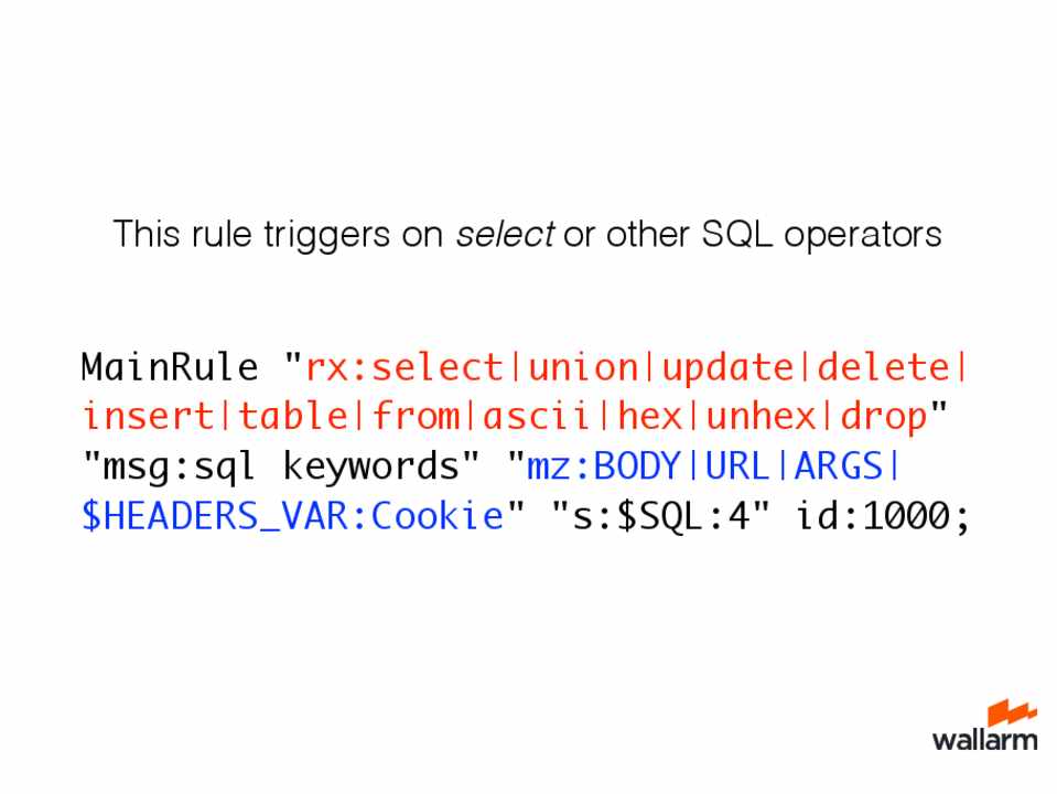 MainRule "rx:select|union|update|delete| insert|table|from|ascii|hex|unhex|drop" "msg:sql keywords" "mz:BODY|URL|ARGS| $HEADERS_VAR:Cookie" "s:$SQL:4" id:1000;