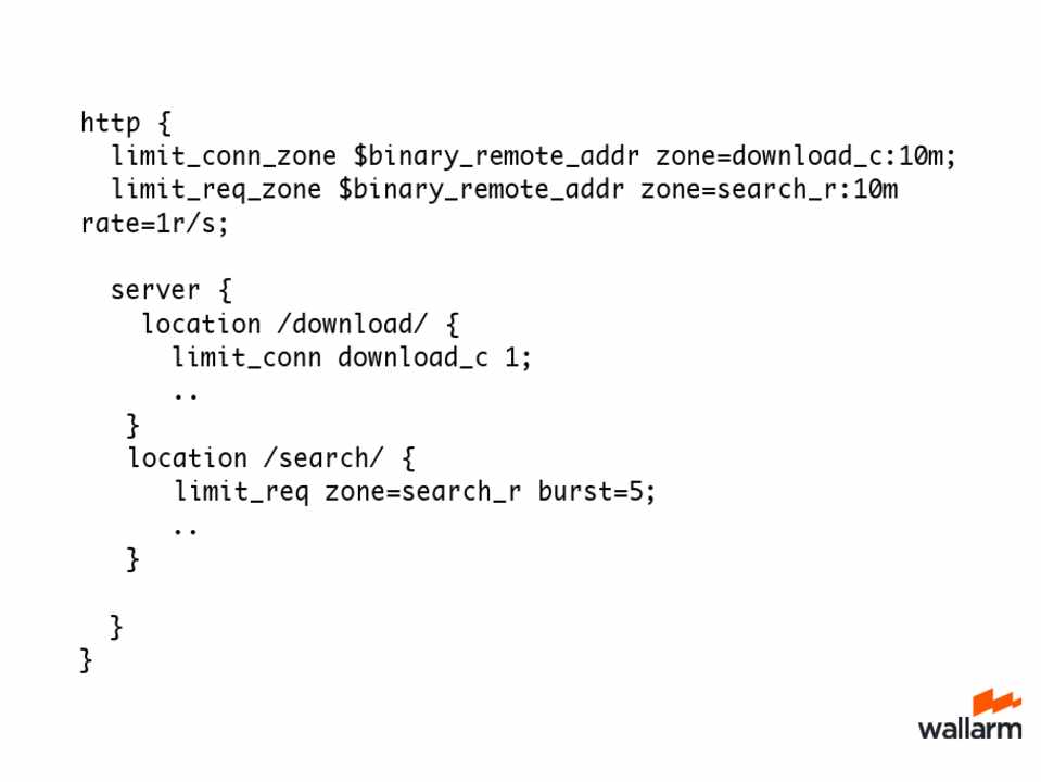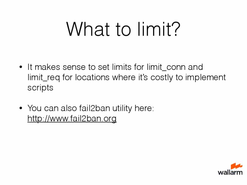 • It makes sense to set limits for limit_conn and limit_req for locations where it’s costly to implement scripts