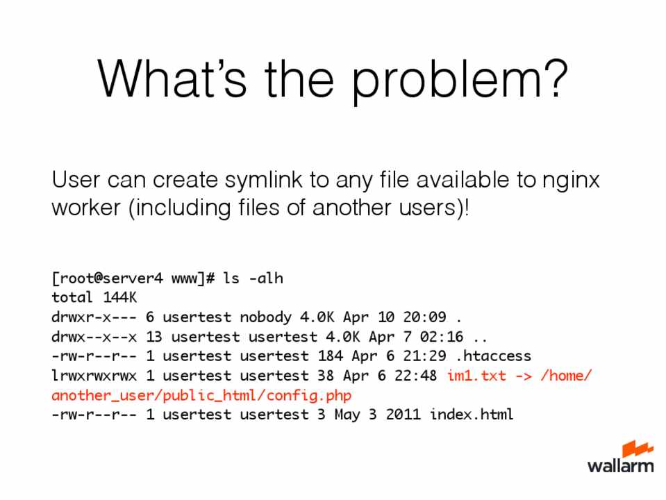 [root@server4 www]# ls -alh total 144K drwxr-x--- 6 usertest nobody 4.0K Apr 10 20:09 . drwx--x--x 13 usertest usertest 4.0K Apr 7 02:16 .. -rw-r--r-- 1 usertest usertest 184 Apr 6 21:29 .htaccess lrwxrwxrwx 1 usertest usertest 38 Apr 6 22:48 im1.txt -> /home/ another_user/public_html/config.php -rw-r--r-- 1 usertest usertest 3 May 3 2011 index.html