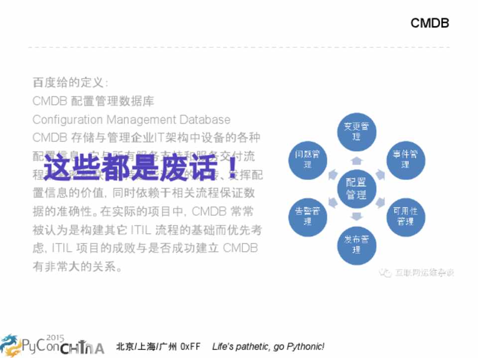 百度给的定义: CMDB 配置管理数据库 Configuration Management Database CMDB 存储与管理企业IT架构中设备的各种 配置信息,它与所有服务支持和服务交付流