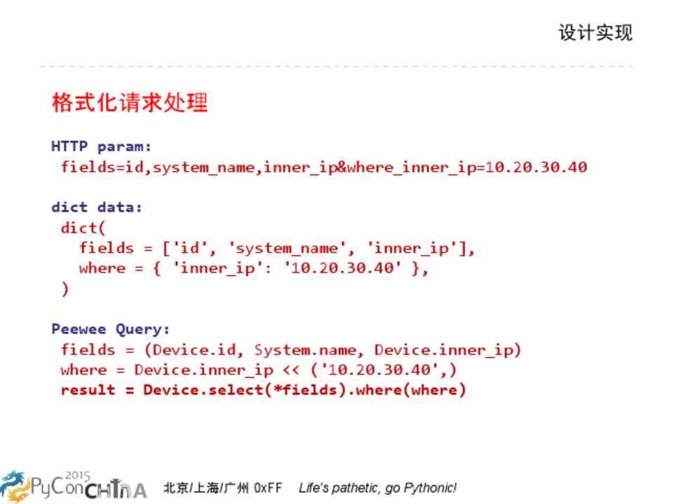 client 请求: cmdbclient.GetDevices( fields = ['id', 'system_name', 'inner_ip'], where = { 'inner_ip': '10.20.30.40' }, )