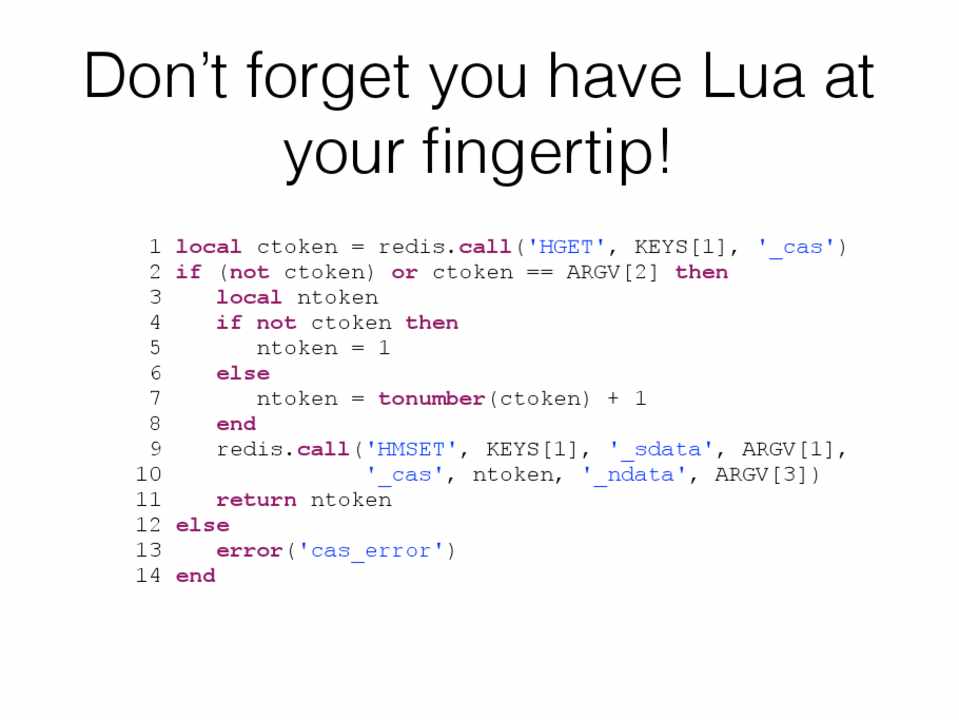 1 local ctoken = redis.call('HGET', KEYS[1], '_cas') 2 if (not ctoken) or ctoken == ARGV[2] then 3 local ntoken 4 if not ctoken then 5 ntoken = 1 6 else 7 ntoken = tonumber(ctoken) + 1 8 end 9 redis.call('HMSET', KEYS[1], '_sdata', ARGV[1], 10 '_cas', ntoken, '_ndata', ARGV[3]) 11 return ntoken 12 else 13 error('cas_error') 14 end