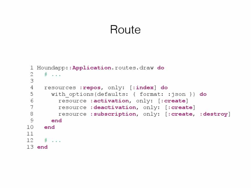 1 Houndapp::Application.routes.draw do 2 # ... 3 4 resources :repos, only: [:index] do 5 with_options(defaults: { format: :json }) do 6 resource :activation, only: [:create] 7 resource :deactivation, only: [:create] 8 resource :subscription, only: [:create, :destroy] 9 end 10 end 11 12 # ... 13 end