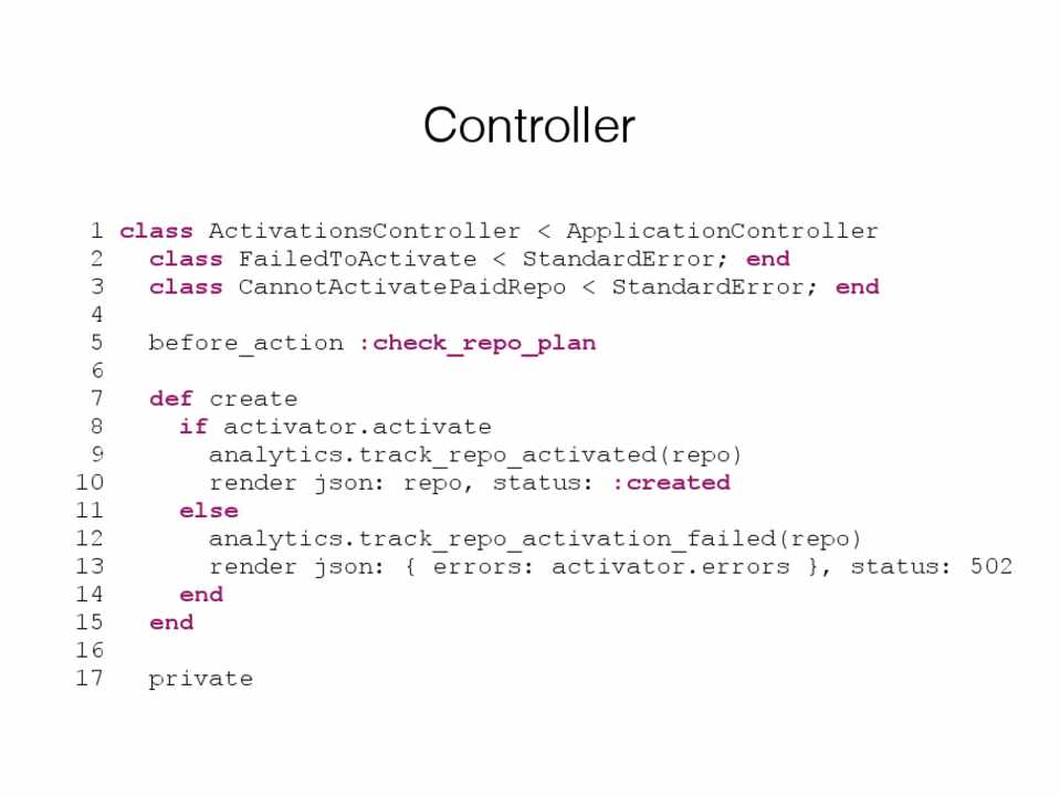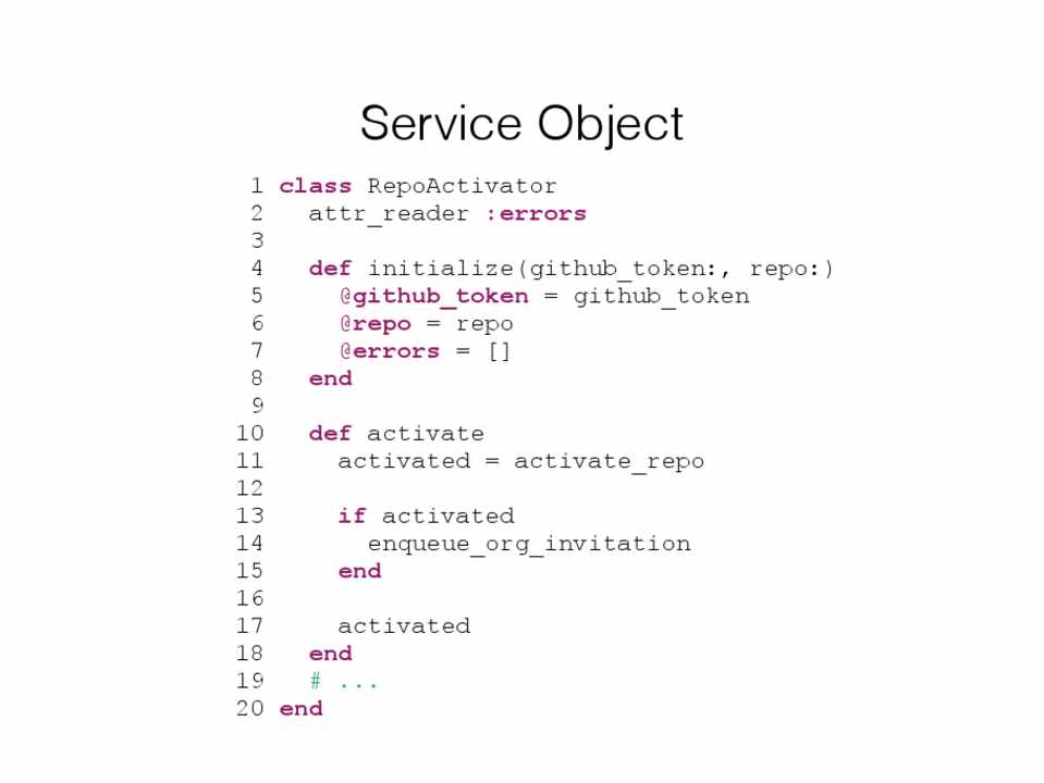 1 class RepoActivator 2 attr_reader :errors 3 4 def initialize(github_token:, repo:) 5 @github_token = github_token 6 @repo = repo 7 @errors = [] 8 end 9 10 def activate 11 activated = activate_repo 12 13 if activated 14 enqueue_org_invitation 15 end 16 17 activated 18 end 19 # ... 20 end