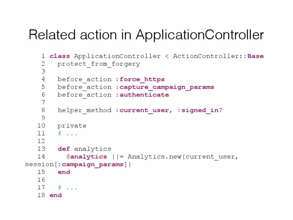 1 class ApplicationController < ActionController::Base 2 protect_from_forgery 3 4 before_action :force_https 5 before_action :capture_campaign_params 6 before_action :authenticate 7 8 helper_method :current_user, :signed_in? 9 10 private 11 # ... 12 13 def analytics 14 @analytics ||= Analytics.new(current_user, session[:campaign_params]) 15 end 16 17 # ... 18 end