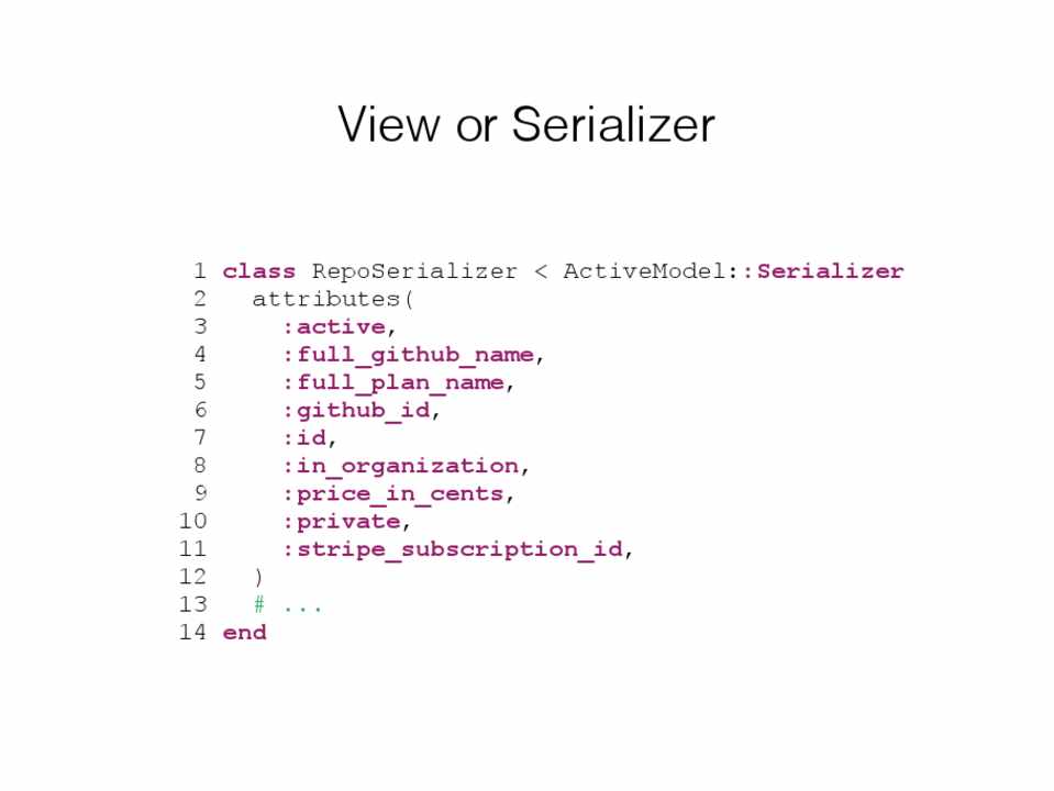 1 class RepoSerializer < ActiveModel::Serializer 2 attributes( 3 :active, 4 :full_github_name, 5 :full_plan_name, 6 :github_id, 7 :id, 8 :in_organization, 9 :price_in_cents, 10 :private, 11 :stripe_subscription_id, 12 ) 13 # ... 14 end