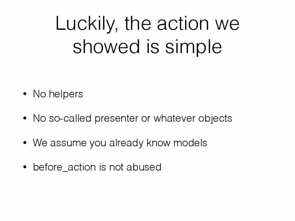 • No helpers • No so-called presenter or whatever objects • We assume you already know models • before_action is not abused