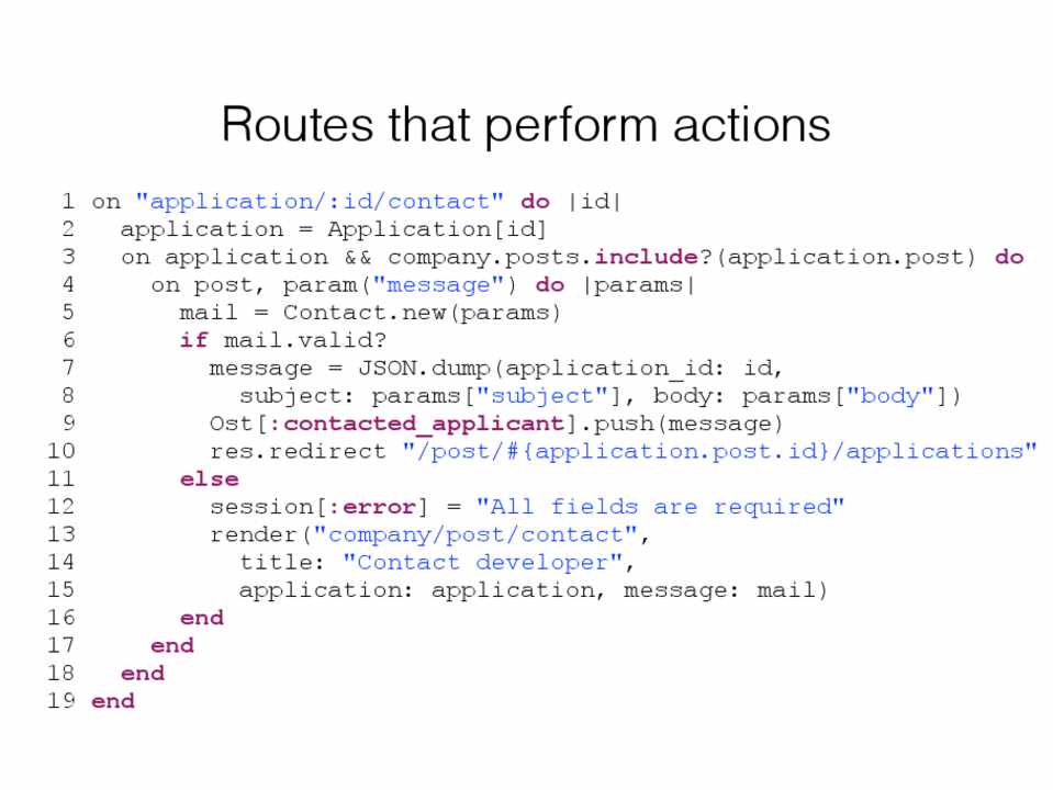 1 on "application/:id/contact" do |id| 2 application = Application[id] 3 on application && company.posts.include?(application.post) do 4 on post, param("message") do |params| 5 mail = Contact.new(params) 6 if mail.valid? 7 message = JSON.dump(application_id: id, 8 subject: params["subject"], body: params["body"]) 9 Ost[:contacted_applicant].push(message) 10 res.redirect "/post/#{application.post.id}/applications" 11 else 12 session[:error] = "All fields are required" 13 render("company/post/contact", 14 title: "Contact developer", 15 application: application, message: mail) 16 end 17 end 18 end 19 end