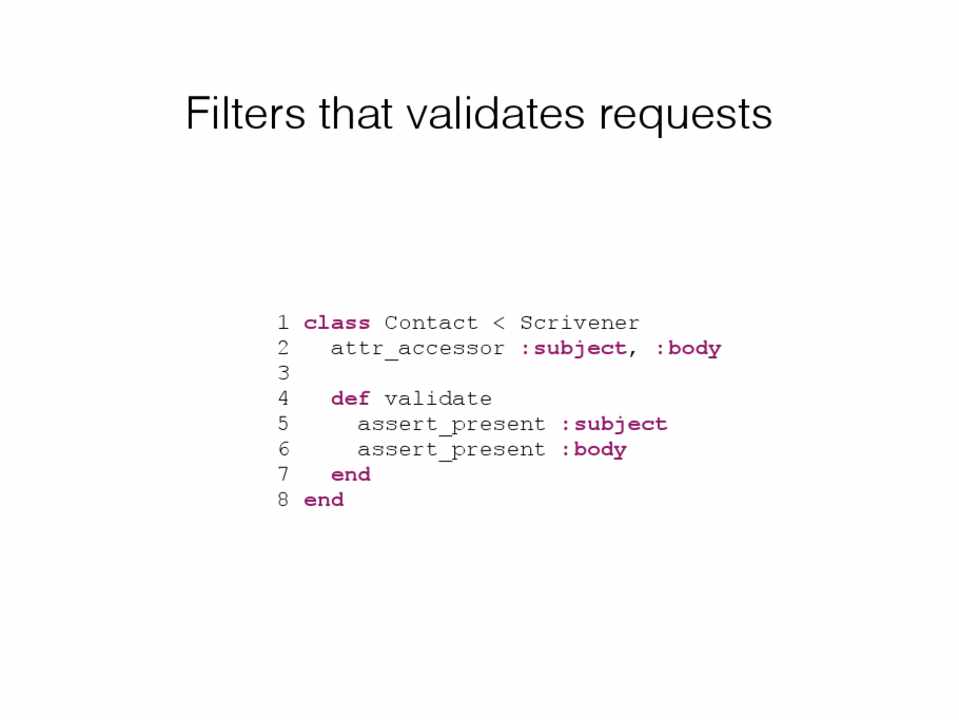 1 class Contact < Scrivener 2 attr_accessor :subject, :body 3 4 def validate 5 assert_present :subject 6 assert_present :body 7 end 8 end