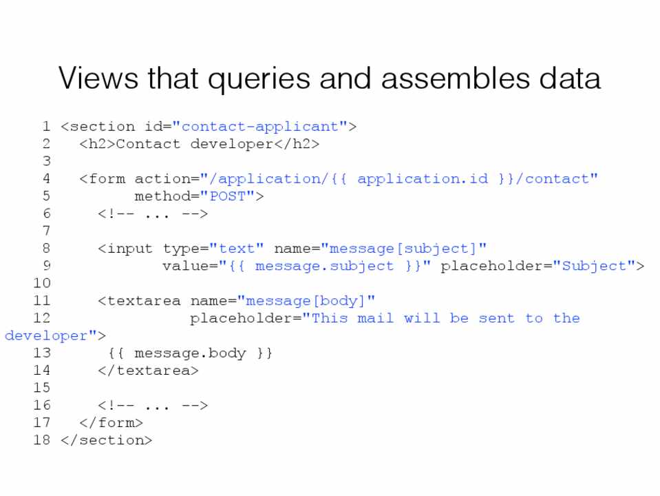 1 <section id="contact-applicant"> 2 <h2>Contact developer</h2> 3 4 <form action="/application/{{ application.id }}/contact" 5 method="POST"> 6 <!-- ... --> 7 8 <input type="text" name="message[subject]" 9 value="{{ message.subject }}" placeholder="Subject"> 10 11 <textarea name="message[body]" 12 placeholder="This mail will be sent to the developer"> 13 {{ message.body }} 14 </textarea> 15 16 <!-- ... --> 17 </form> 18 </section>