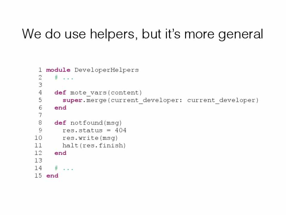 1 module DeveloperHelpers 2 # ... 3 4 def mote_vars(content) 5 super.merge(current_developer: current_developer) 6 end 7 8 def notfound(msg) 9 res.status = 404 10 res.write(msg) 11 halt(res.finish) 12 end 13 14 # ... 15 end