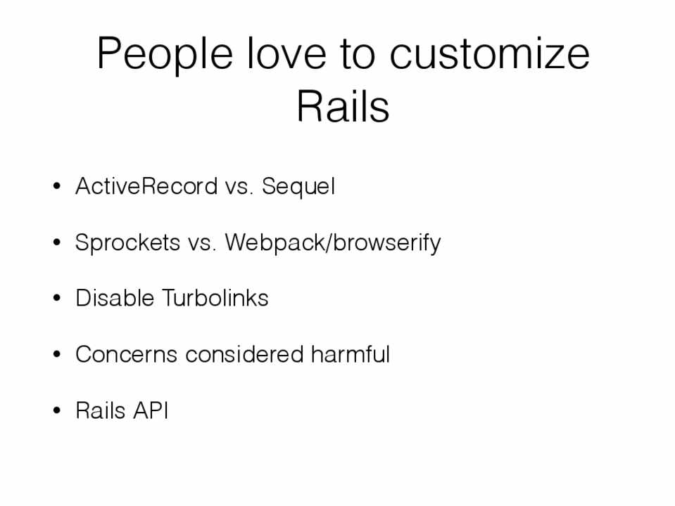 • ActiveRecord vs. Sequel • Sprockets vs. Webpack/browserify • Disable Turbolinks • Concerns considered harmful • Rails API