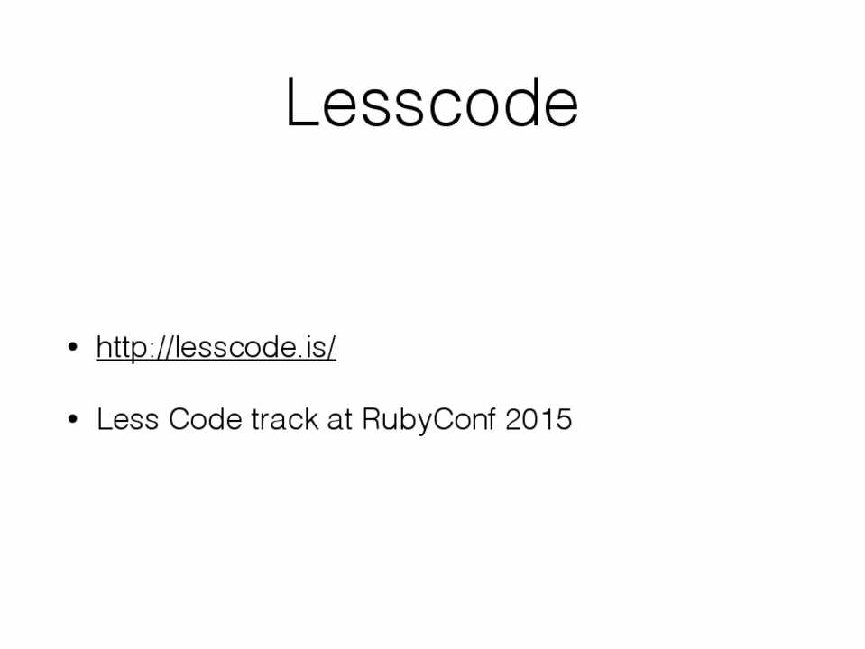 • http://lesscode.is/ • Less Code track at RubyConf 2015