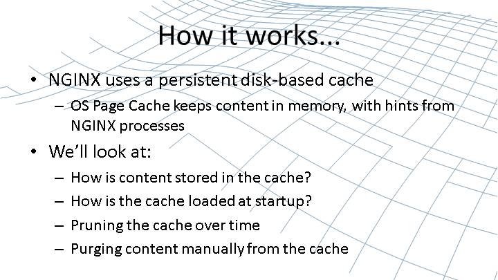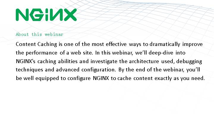 Content Caching is one of the most effective ways to dramatically improve the performance of a web site. In this webinar, we’ll deep-dive into NGINX’s caching abilities and investigate the architecture used, debugging techniques and advanced configuration. By the end of the webinar, you’ll be well equipped to configure NGINX to cache content exactly as you need.