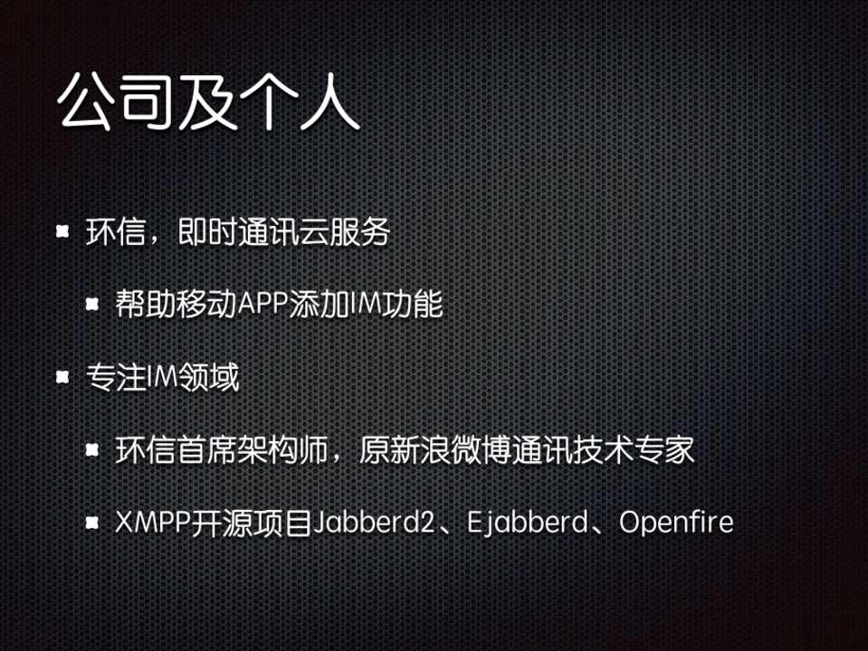 专注IM领域 环信⾸首席架构师,原新浪微博通讯技术专家 XMPP开源项⽬目Jabberd2、Ejabberd、Openfire