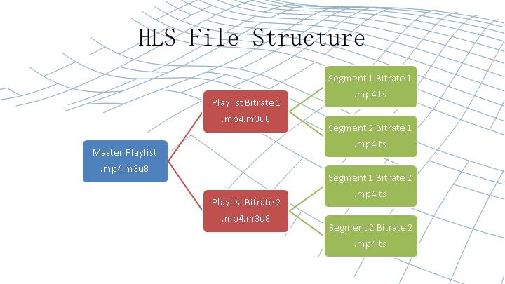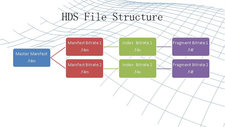 Here we see the file structure for HDS. Again I have assumed 2 bitrates. So there is a master manifest that points to the manifest for each bitrate. These manifest then point to an index which points to the fragment file. Again if you have only a single bitrate there will not be a master manifest.