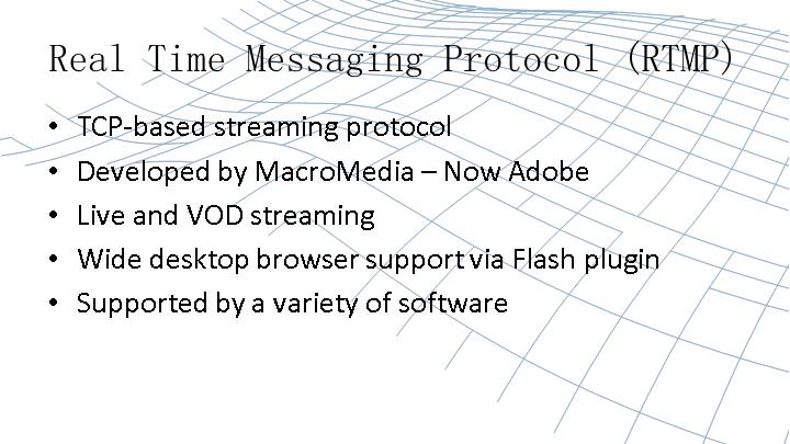 Another way of doing video streaming that doesn’t use HTTP, is to use the Real Time Messaging Protocol or RTMP. This can support both live video and video on demand and is supported across various desktop browsers by means of a Flash plugin, and it is also supported by many other software programs.