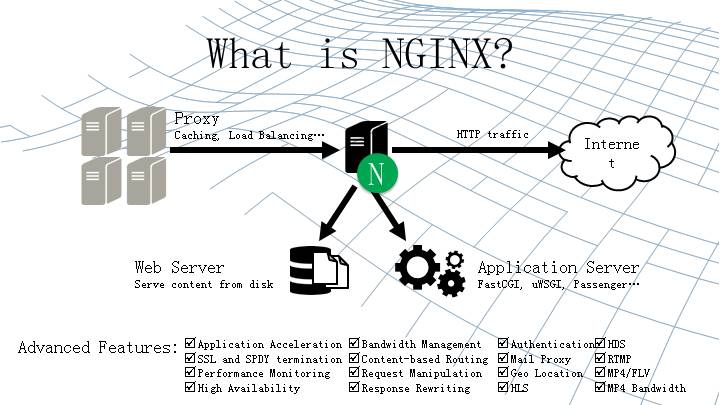 First off, what is NGINX? NGINX is a high performance web server of static content, including video and also a full reverse proxy or Application Delivery Controller with many advanced features. For dynamic content it can connect to application servers over HTTP, FastCGI, uWSGI, Passenger and other methods.