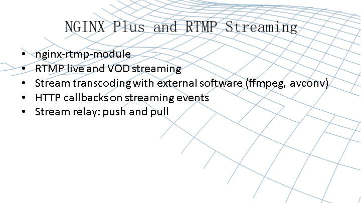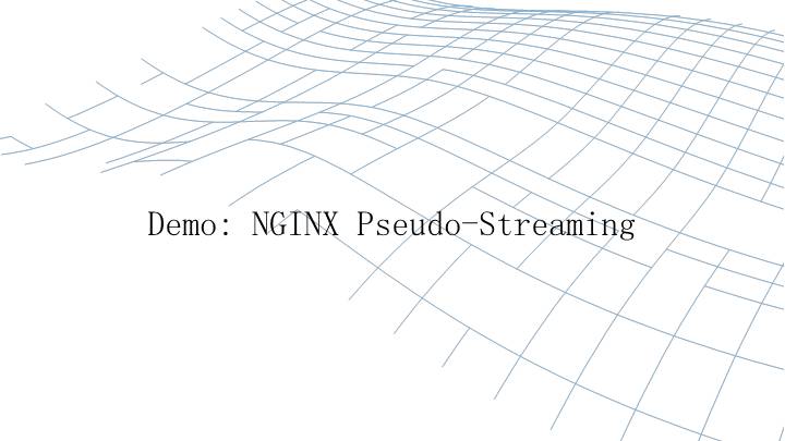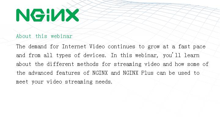 The demand for Internet Video continues to grow at a fast pace and from all types of devices. In this webinar, you'll learn about the different methods for streaming video and how some of the advanced features of NGINX and NGINX Plus can be used to meet your video streaming needs.