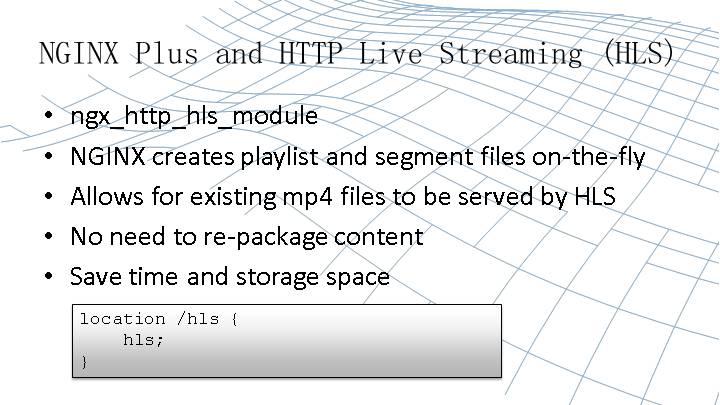 We’ll start with HLS. NGINX Plus includes a HLS module. You may remember that when I talked about HLS previously I mentioned that the content needs to be re-packaged into a playlist and segment files. One of the nice features of the NGINX Plus HLS module is that it can do this re-packaging for you, on-the-fly. So you can take your existing mp4 files and start serving them with HLS without having to do anything to the files. Just point NGINX Plus at your mp4 files and NGINX Plus will do the rest. If you want to support multiple bitrates, then all you need to do is create a master playlist pointing to the playlist for each bitrate. These playlist files won’t actually exist, but NGINX will create them automatically at run time.