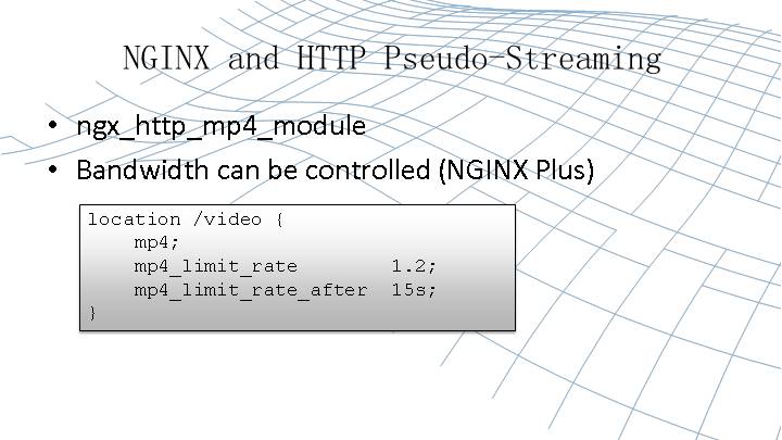 Now, adaptive bitrate streaming is great and I’ve talked about some of its advantages, but not all client devices may support it, so you may still want to support pseudo-streaming and that is something supported in NGINX open source, but NGINX Plus adds the ability to control the bandwidth used by a client over a connection. mp4_limit_rate is multiplied by the bitrate, so in this example we will allow 1.2 times the encoded bitrate for each connection. mp4_limit_rate_after tells NGINX Plus to delay starting to limit the bandwidth for the specified time after the download begins. So in this example, 15 seconds. This allows the client to buffer an initial amount of video before before the limit kicks in.