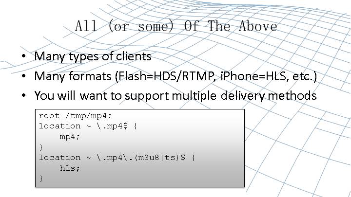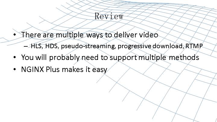 As we come to the end, let’s do a quick review. We talked about a number of ways that can be used to deliver video, including HLS, HDS, pseudo-streaming, progressive download and RTMP. And given the vast array of different mobile clients, desktop browsers and other clients, you will probably need to support many of these methods. NGINX Plus supports all of them, and does it in a way that is easy to configure.