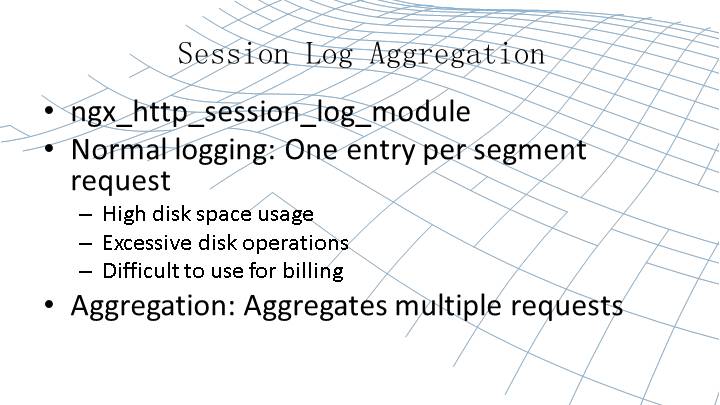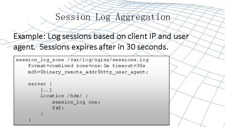 As you saw when I did the demos, if you have access logging turned on, like I do, you will get an entry for each individual request during the streaming. That was good for my demos, to show you what was going on, but for a production system, with possibly thousands, tens of thousands or even more clients, you can image how many log entries would result. This can cause very high disk usage and excessive disk operations and also is too granular to use for billing if that is necessary. NGINX Plus introduces the ability to aggregate log entries based on criteria you specify so you get higher level log entries rather then one for each segment. This results in less disk storage, less disk I/O and data that is much more useful for billing.