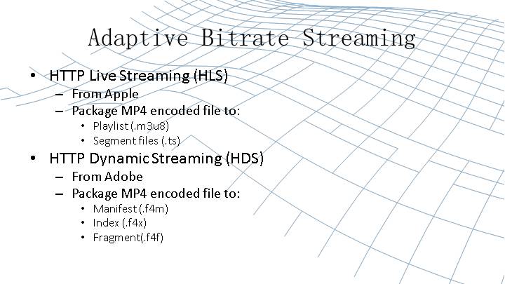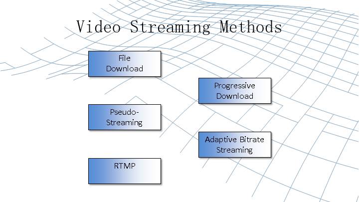 Today the methods I will be talking about are file download, progressive download, pseudo-streaming, adaptive bitrate streaming and RTMP.