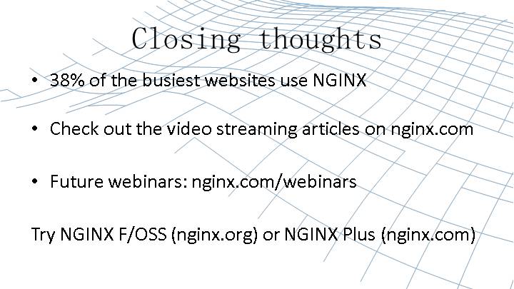Thank you for taking the time to attend this session. I hope it was of use to you and I hope you attend some of our future webinars. You will find additional information about video streaming at nginx.com. And it is easy to test out either the open source version of NGINX or NGINX Plus.