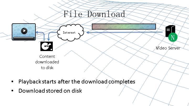 We will start with the simplest way of delivering video content and that is to download the complete media file to your local hard drive and then playing the video. The process is very straight forward. The file is downloaded from the video server to the local machine and once the download completes the video can be played. This means that you have to wait for the entire file to be downloaded before playback can begin and if the file is large or your link is slow this can take a very long time and if you are unlucky and run into connection errors, the download may never complete. So there is obviously room for improvement.