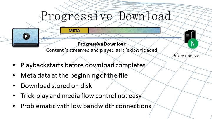 An improvement over simply downloading a file is progressive download. In this scenario, the meta data for the media file (that is the information needed by the video player to know how to play the video) is downloaded first, then the download of the rest of the file begins and after a certain amount of data is buffered by the player it is able to start playing the video. The file will continue to download and as long as the file downloads faster then the video plays, you will experience smooth playback. If your link is slow, then the playback may stall while the player waits for more data to be buffered. I’m sure you have all encountered this phenomena. So this method does not handle slow connections well and you aren’t able to use trick play features such as fast forward, jumping to a certain part of the video, etc.