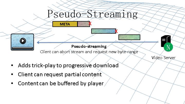 Pseudo-streaming is an advance on simple progressive download in that the player can ask for specific byte ranges, thus enabling some trick play features and also the player can buffer the data without necessarily having to write the data to disk.