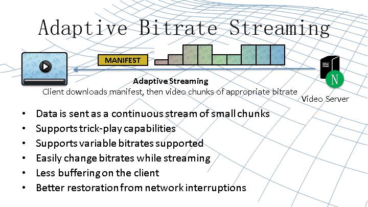 A big step forward came with the advent of adaptive bitrate streaming. This delivers the media in a different way then the progressive download and pseudo-streaming methods we have been talking about. Here a media file is repackaged as a series of smaller segments, each with just a few seconds of video. A playlist or manifest file is then created that acts as a table of contents for the segments. What adaptive bitrate refers to is that there can be different versions of the same video, each encoded with a different bitrate. Think of a having a high definition and low definition version of the same video and even versions in between. The high definition version would be appropriate for a high bandwidth link and the low definition version appropriate for a low bandwidth link. With adaptive bitrate streaming the player can switch seamlessly between bitrates depending on the speed of the connection and can easily skip forward or backward through the segment files. By being able to adapt to network conditions using different bitrates the client can see a better quality of service, and the player can also more easily recover from network interruptions.