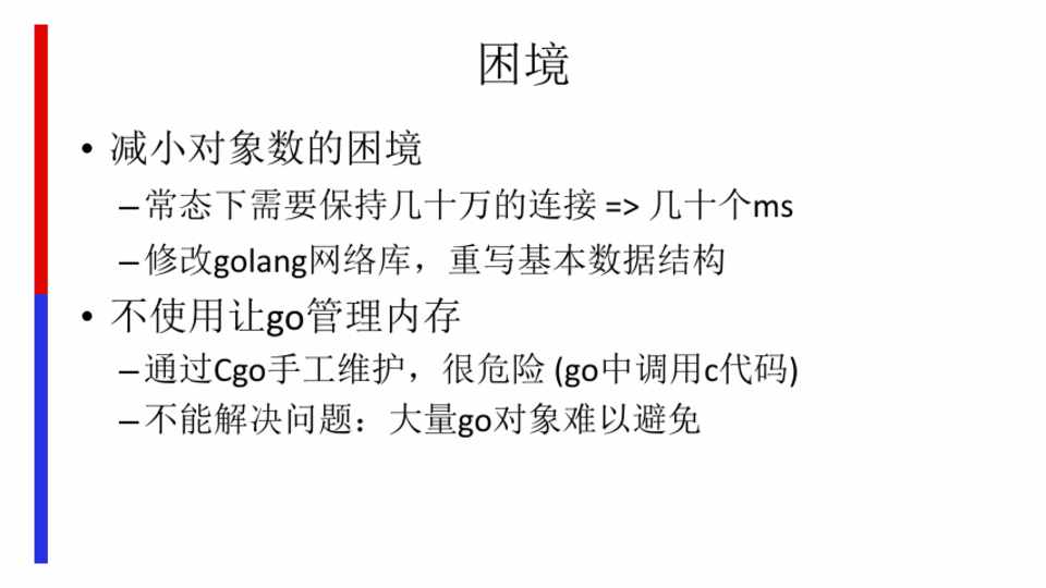 – 常态下需要保持几十万的连接 => 几十个ms – 修改golang网络库,重写基本数据结构