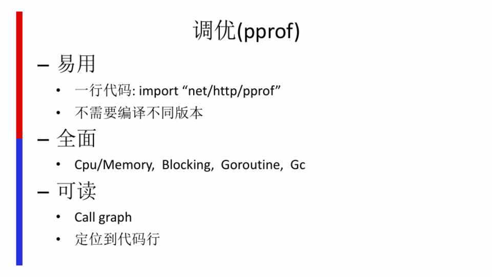 • 一行代码: import “net/http/pprof” • 不需要编译不同版本