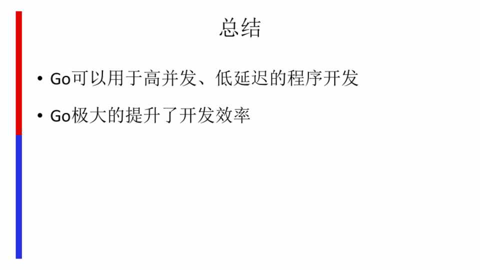 • Go可以用于高并发、低延迟的程序开发 • Go极大的提升了开发效率