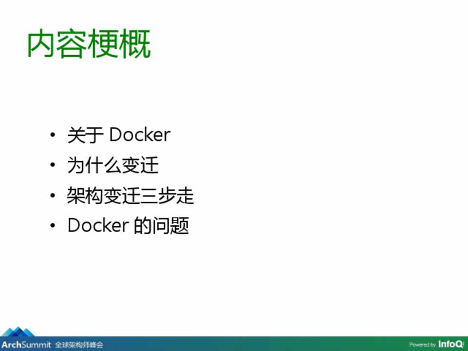 • 关于 Docker • 为什么变迁 • 架构变迁三步走 • Docker 的问题