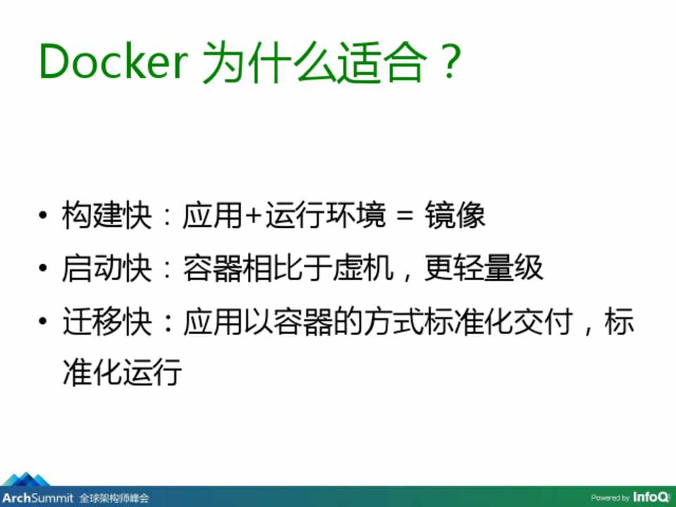 • 构建快:应用+运行环境 = 镜像 • 启动快:容器相比于虚机,更轻量级 • 迁移快:应用以容器的方式标准化交付,标