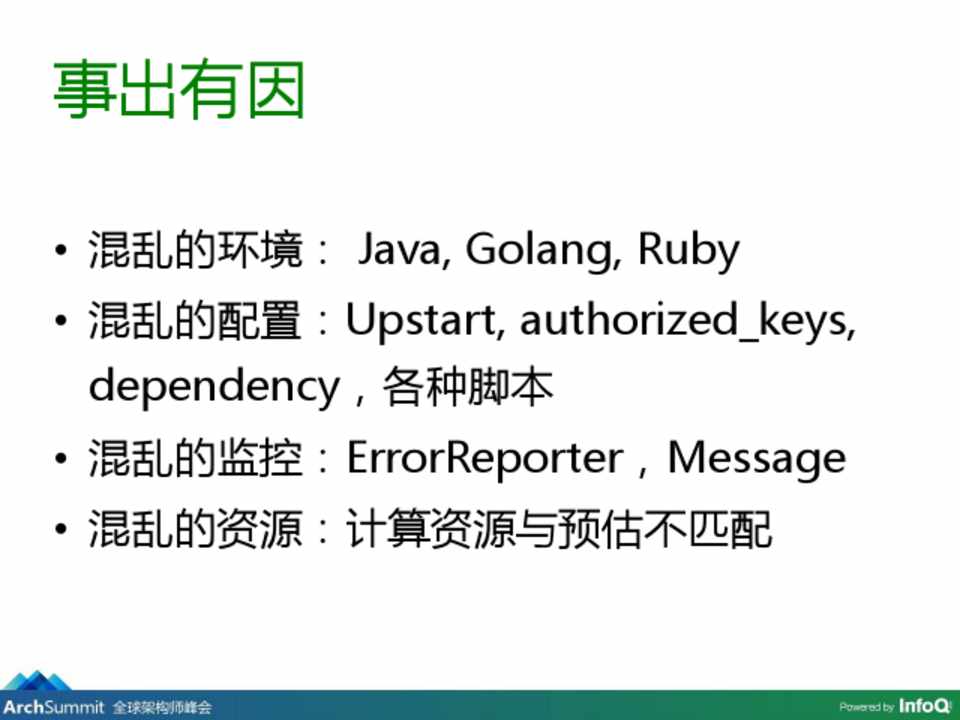 • 混乱的环境: Java, Golang, Ruby • 混乱的配置:Upstart, authorized_keys,
