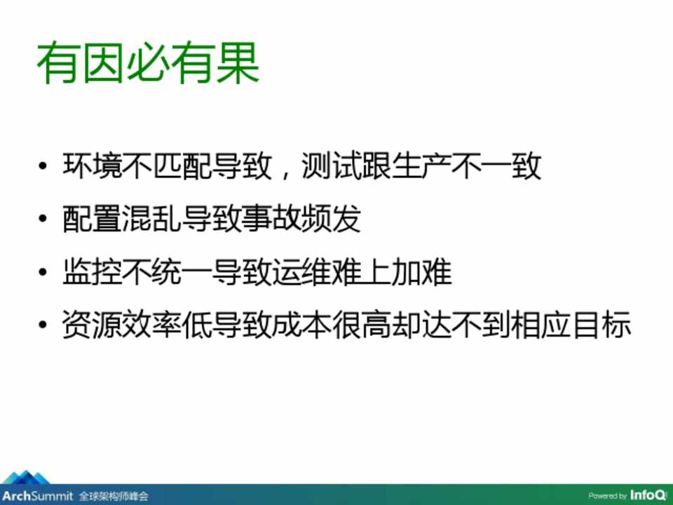 • 环境不匹配导致,测试跟生产不一致 • 配置混乱导致事故频发 • 监控不统一导致运维难上加难 • 资源效率低导致成本很高却达不到相应目标