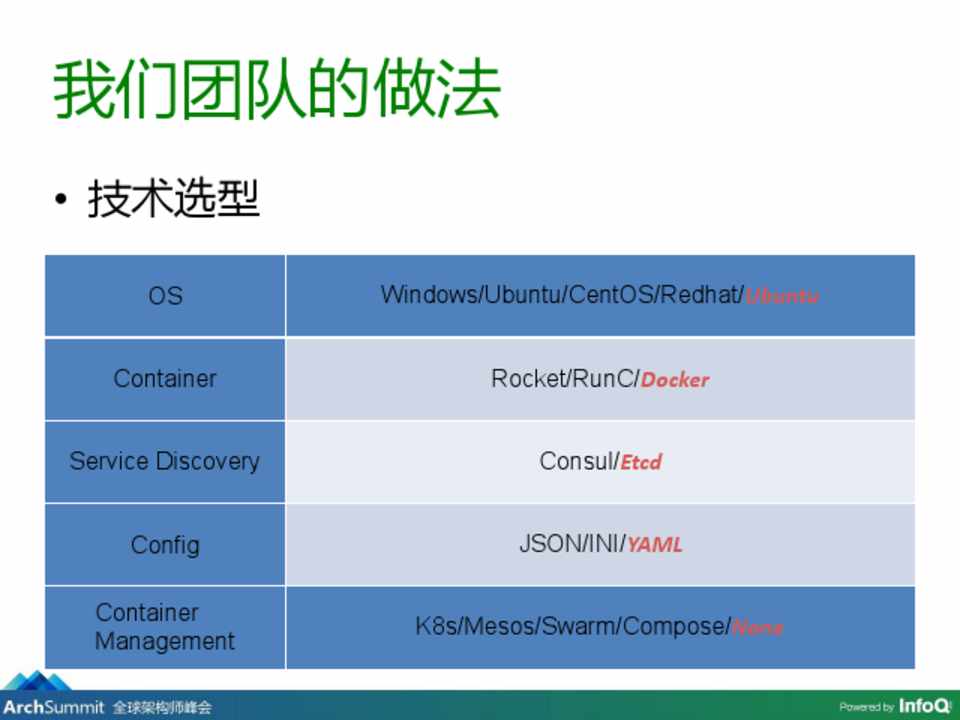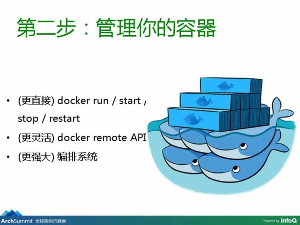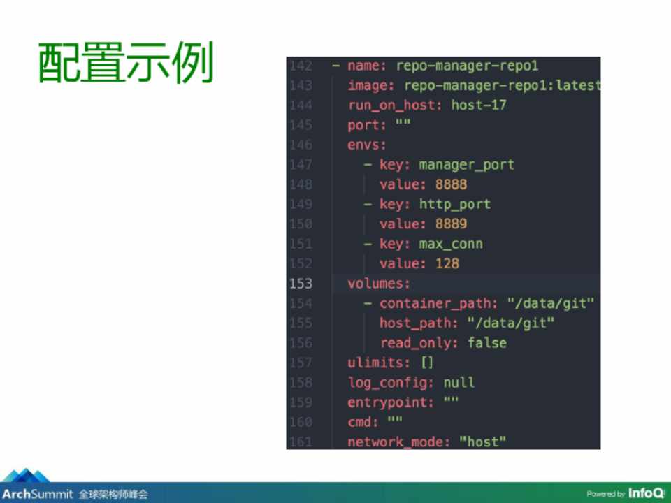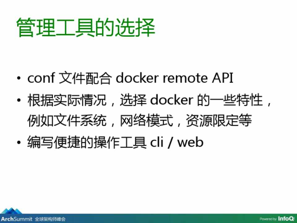 • conf 文件配合 docker remote API • 根据实际情况,选择 docker 的一些特性,