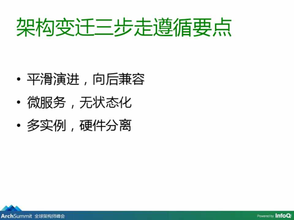 • 平滑演进,向后兼容 • 微服务,无状态化 • 多实例,硬件分离