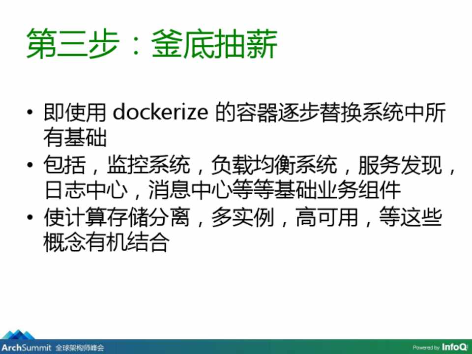 • 即使用 dockerize 的容器逐步替换系统中所 有基础
