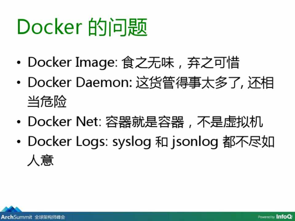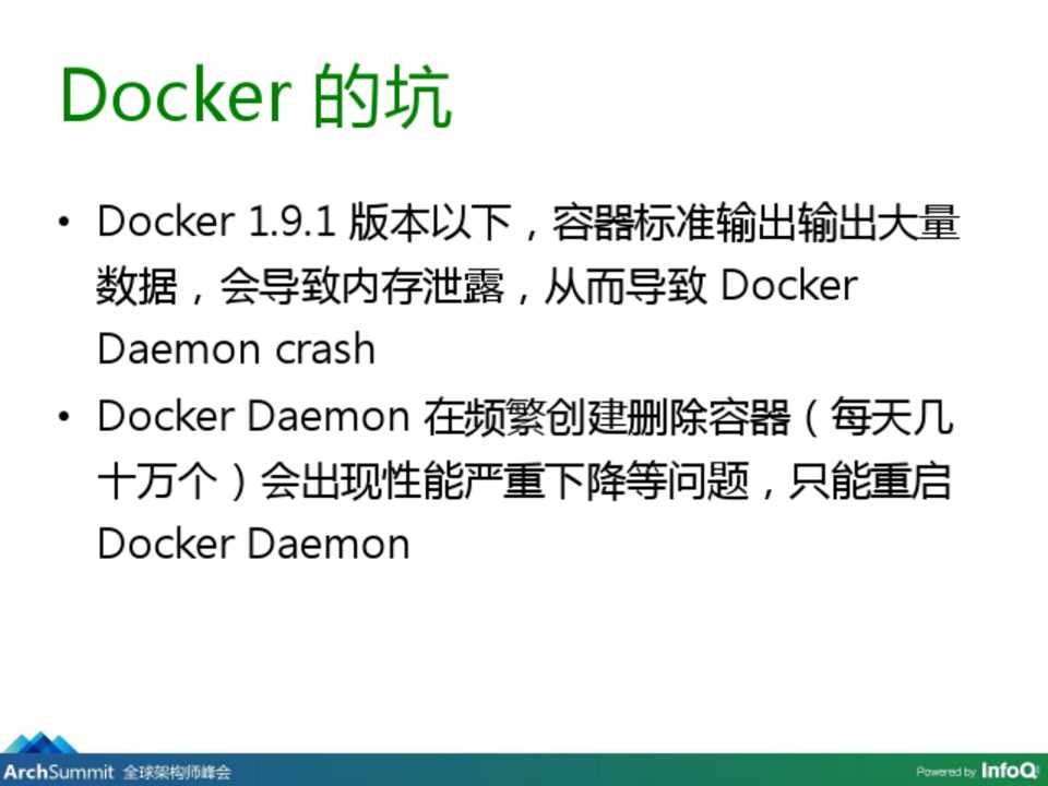 • Docker Daemon 在频繁创建删除容器(每天几 十万个)会出现性能严重下降等问题,只能重启 Docker Daemon